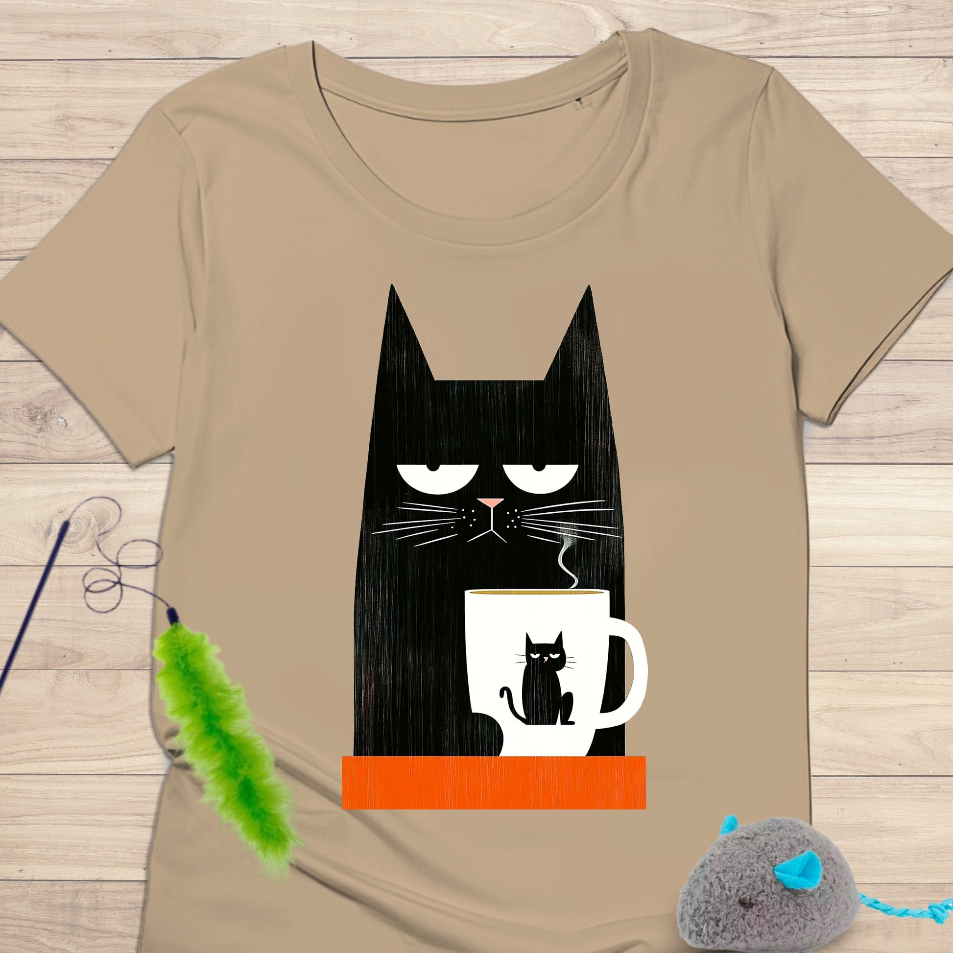 La camiseta “Coffee Cat” combina minimalismo, humor felino y estética retro en un diseño limpio y muy expresivo. Un gato negro de mirada cansada acompañado de su taza de café crea una escena cotidiana con la que cualquiera puede identificarse: mañanas lentas, café caliente y actitud tranquila.